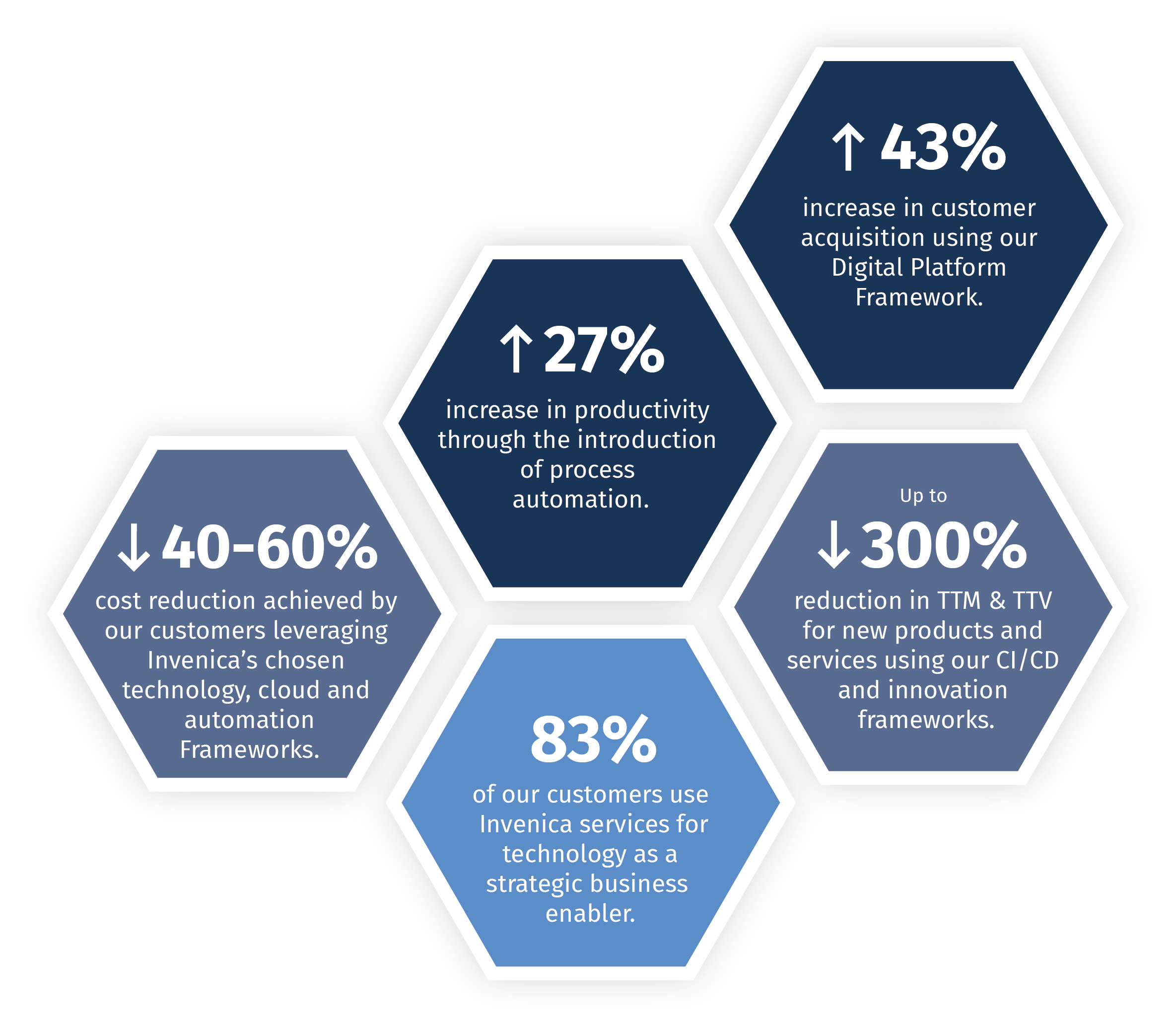Our average customer results demonstrate the returns that we can achieve. Invenica are innovation technologists that enable businesses to stay ahead of the market and competition, to access the opportunities of new technologies that reduce costs, increase operational capability – making you more competitive, with greater customer retention. We cover all aspects of DLT/Blockchain, Public Cloud Migration, Continuous Integration, Continuous Delivery, Digital platforms, AI, Big Data Analytics, IoT and NLU platforms. For us these are not trends, but vital business tools.
